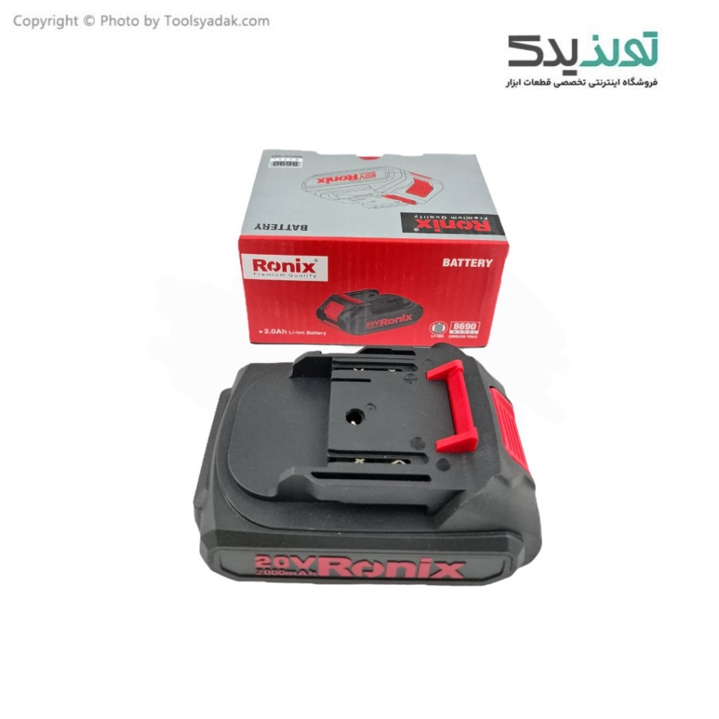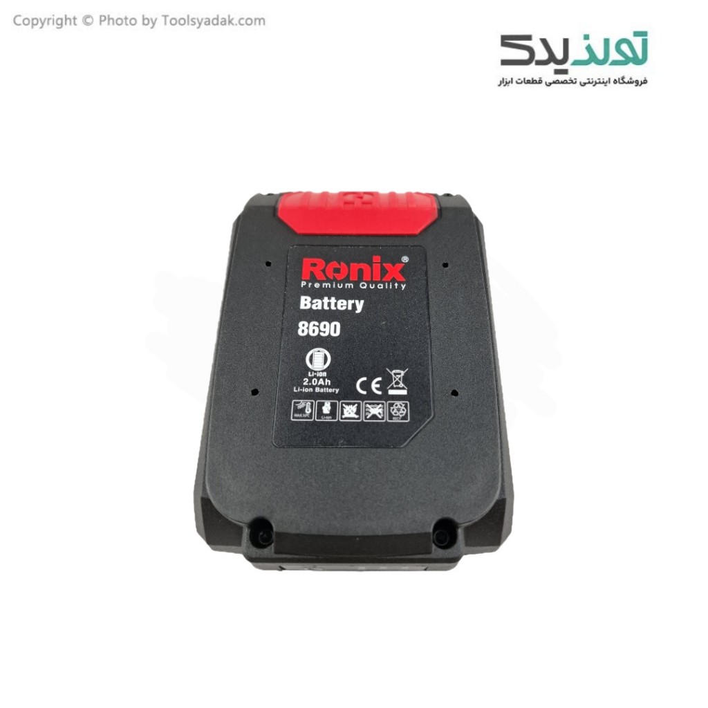 باتری لیتیوم یون 20 ولت رونیکس مدل 8690 از خانواده باتری های قابل شارژ است که در زمان واحد، تخلیه یون های لیتیوم از الکترود منفی به سمت الکترود مثبت و در هنگام شارژ شدن وارونه حرکت می کند، این باتری ها بالاترین چگالی انرژی را دارد. ولتاژ این باتری 20 ولت می باشد. لازم به ذکر است این باتری مجهز به چراغ LED نشانگر میزان شارژ باتری نیز است.